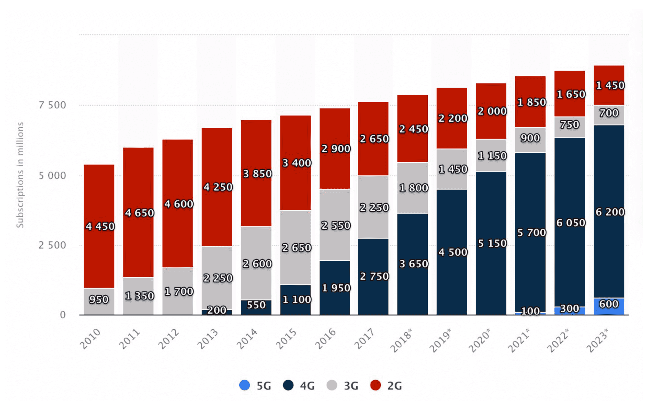 We can look at the number of wireless devices subscriptions per generation worldwide with a forecast to 2023: