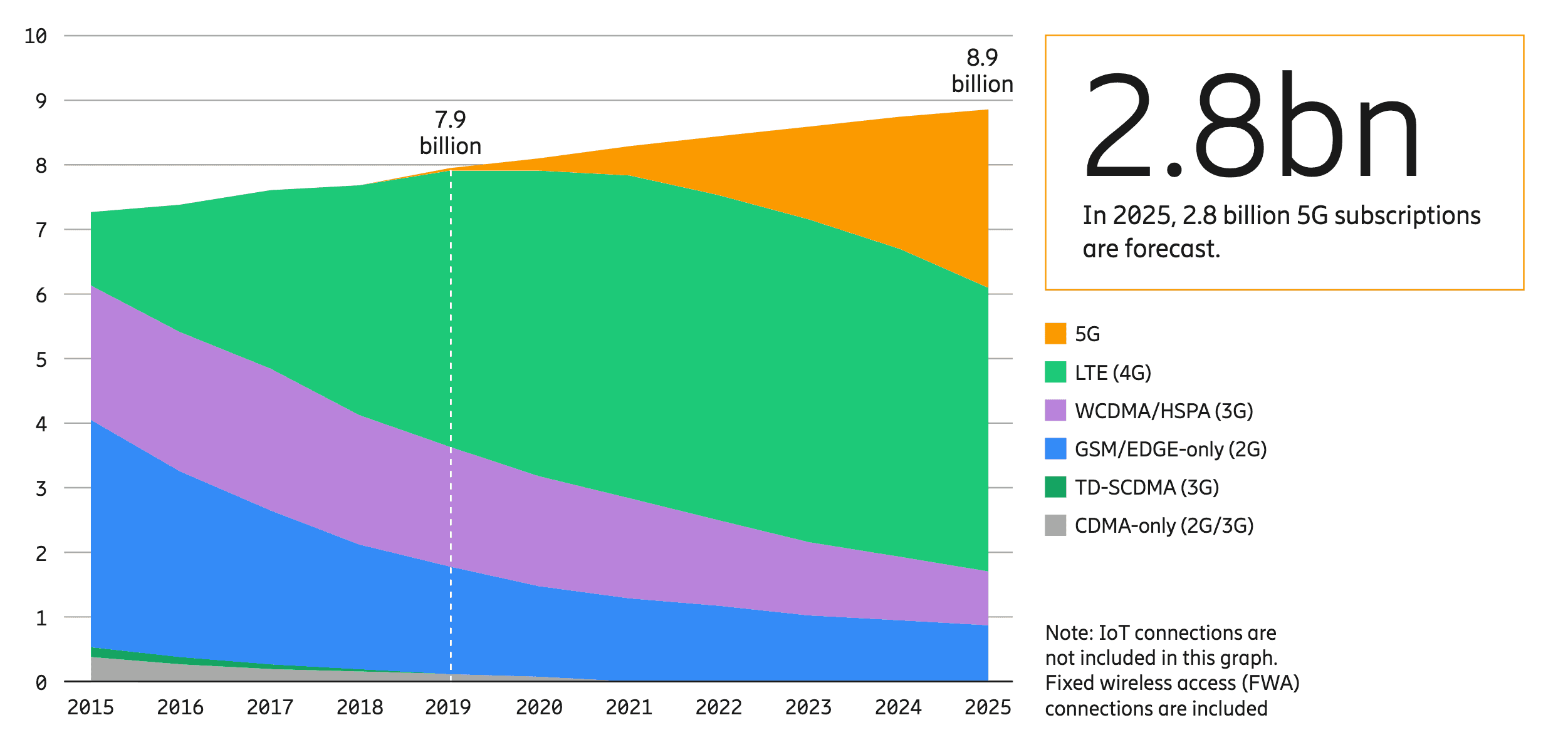 The number of 5G subscribers is forecasted to be 2.8 billion worldwide.