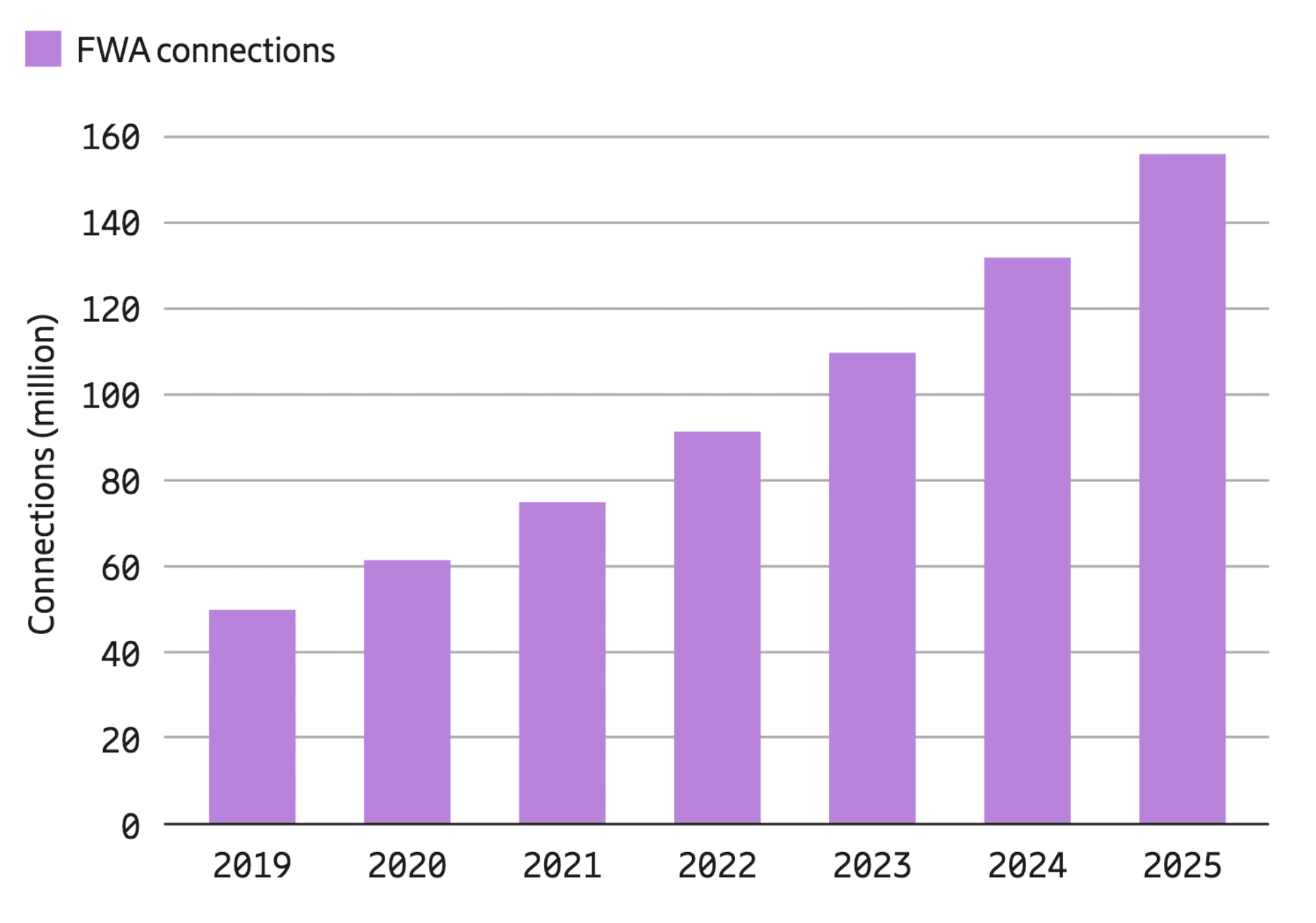 Up to 50% of the world population still has no reliable access to broadband internet. The cost and complexity of providing fixed broadband have always been deterring the reach of high-speed data services to suburban and rural areas. 5G presents a viable alternative to laying fiber, cable, and DSL cables into those areas. For instance, many small businesses in rural areas currently do not benefit from broadband data access and the new infrastructure will provide new opportunities for them. Operators that offer FWA still have a large untapped market which they can sell to.